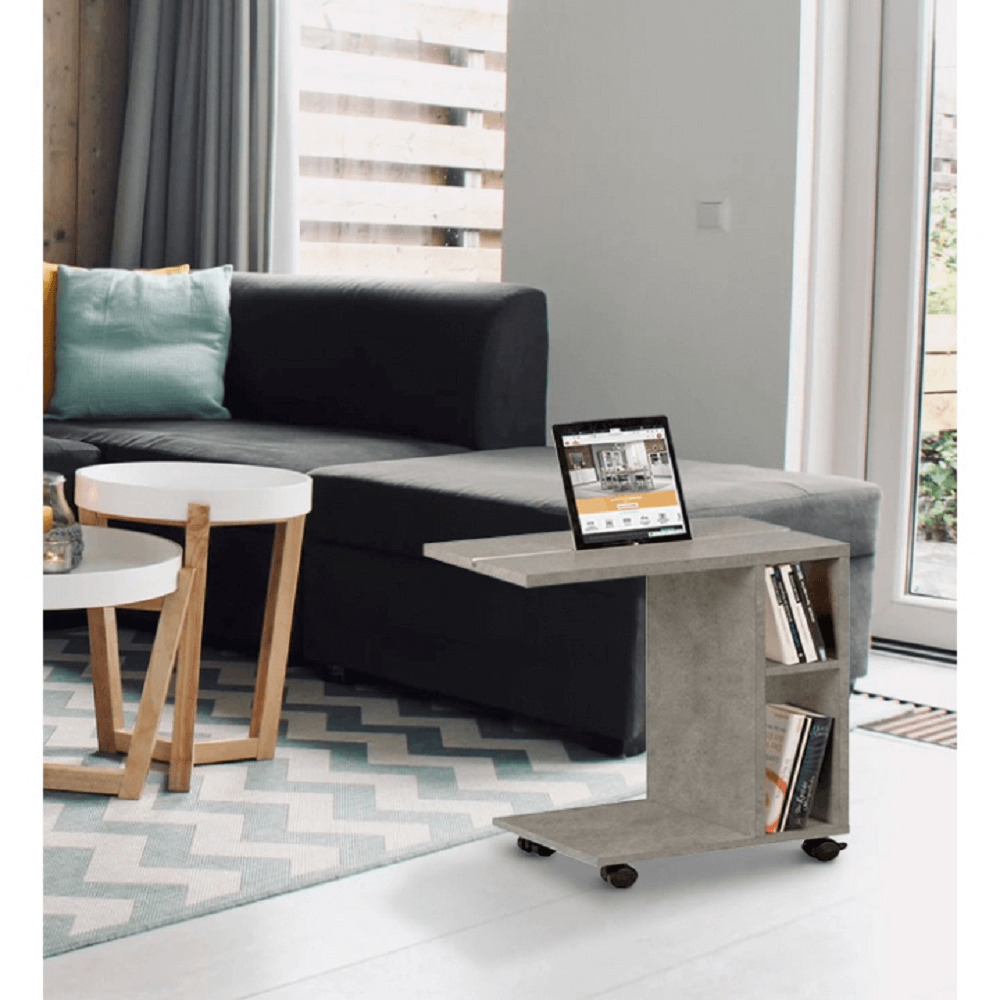 Stůl NIDEN má výřez pro tablet, takže jej můžete snadno a pohodlně umístit, aniž byste ho museli držet v ruce. Kromě toho nabízí dvě police, které jsou ideální pro odkládání knih, časopisů nebo pracovních materiálů. Vyrobený je z kvalitní dřevotřísky v dekoru světlý beton, což mu dodává moderní vzhled a zajišťuje jeho dlouhou životnost. S tímto stolíkem bude práce i volný čas mnohem příjemnější.
