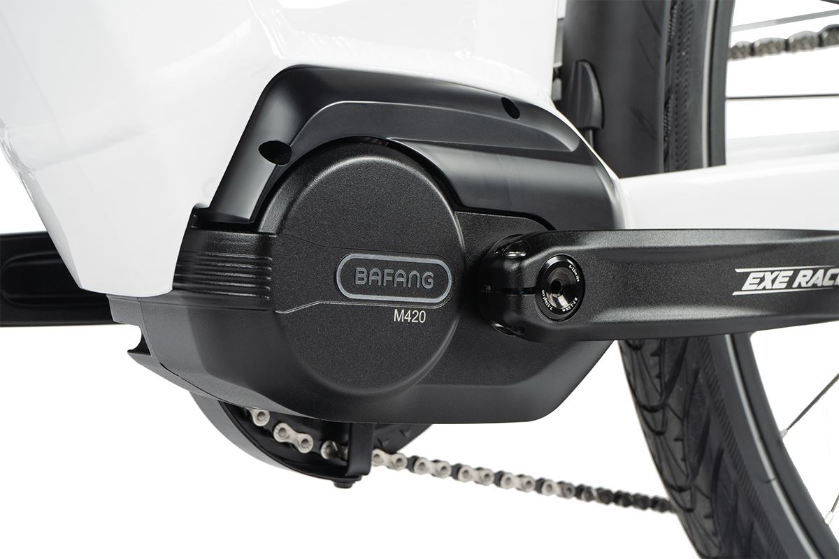 Elektromotor Bafang M420 vyniká velmi plynulým a tichým chodem a nadprůměrným výkonem. Nabízí nominální výkon 250 W, max. výkon 550 W a vysoký kroutící moment až 80 Nm. Je vybaven torzním snímačem síly šlapání. To znamená, že čím větší silou cyklista šlape, tím větší silou mu motor pomáhá. K motoru lze namontovat snímač řazení (Gear senzor), který vám umožní snadno a rychle měnit rychlosti za všech okolností.