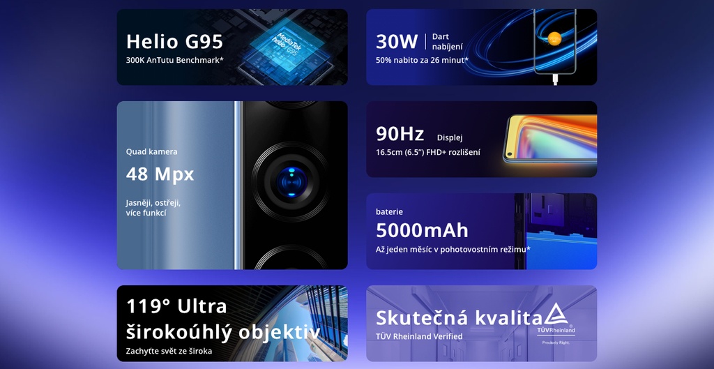 Procesor Helio G95 dosahuje rychlosti až 2,05 GHz CPU, který využívá kombinaci nejnovějších procesorů Cortex-A76 a Cortex-A55. Představen je také nejnovější grafický procesor ARM Mali-G76, který dosahuje rychlosti až 900 MHz a vybavuje realme 7 energií pro hraní náročných her, neuvěřitelně hladce.
