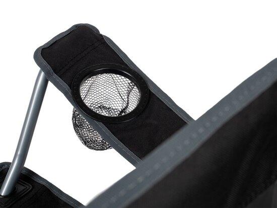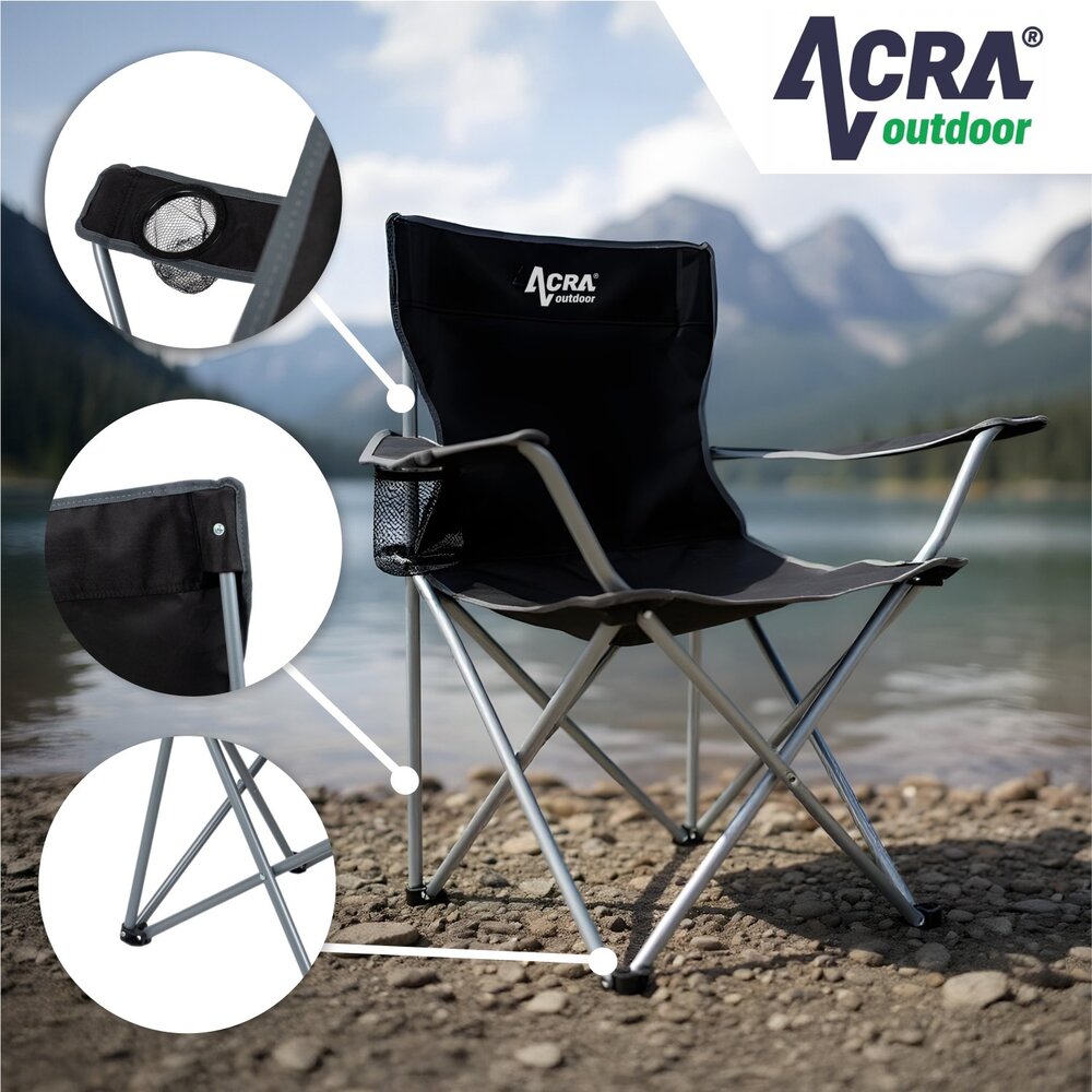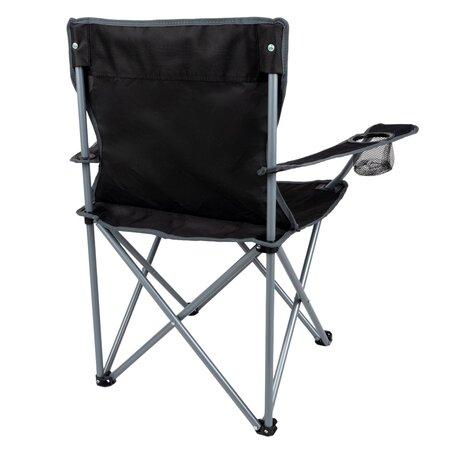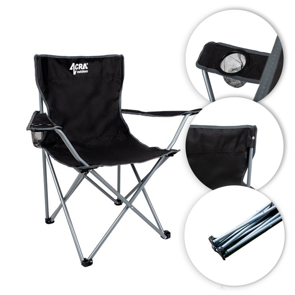 Skládací křeslo - univerzální. Konstrukce - ocelové trubky o průměru 16mm. Sedák opěrka a područky - PES Oxford 600 D. Rozměry v rozloženém stavu jsou 50x50x80cm. Sedák je ve výšce 40 cm od země. Křeslo je snadno přenosné a lze ho libovolně použít na venkovní i vnitřní sezení. Vhodné na kempování, na pláž, na ryby atd. Nosnost je 95 kg. Dodáváme v barvě černé - viz foto.