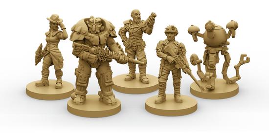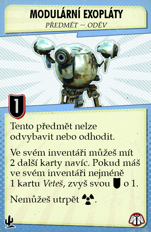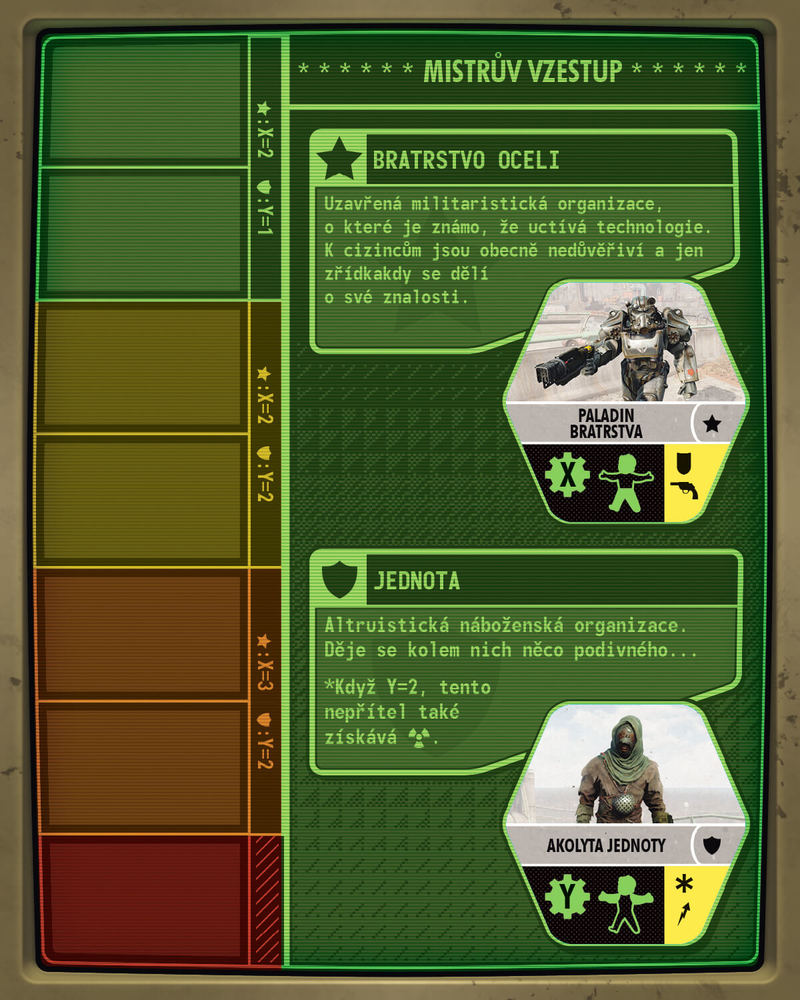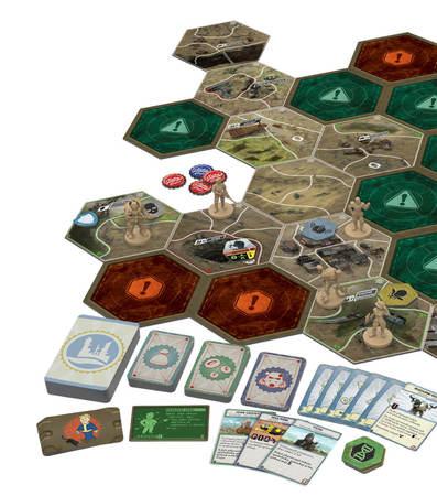 22 karet střetnutí v osadě, 6 značek úkolů, 19 karet střetnutí ve vaultu, 7 karet perků, 9 speciálních karet, 6 žetonů zátek, 6 žetonů nepřátel,