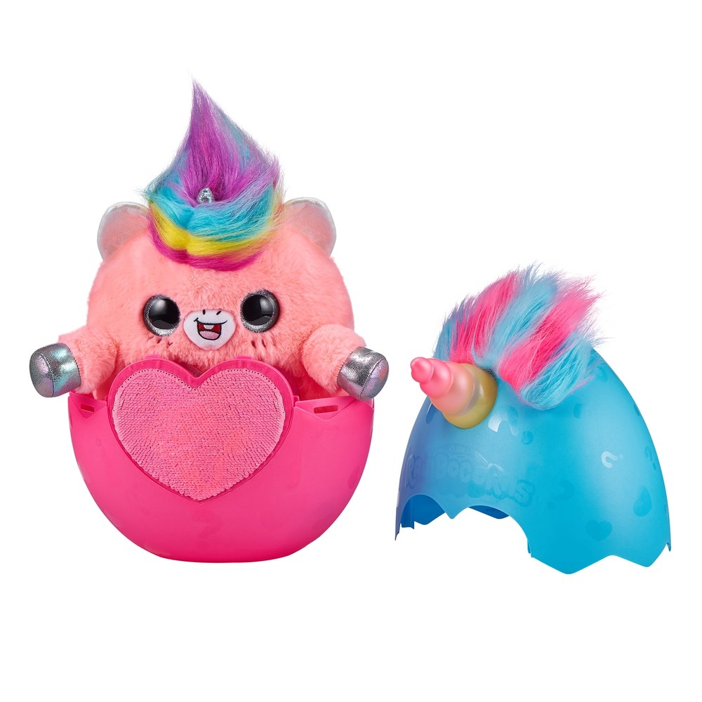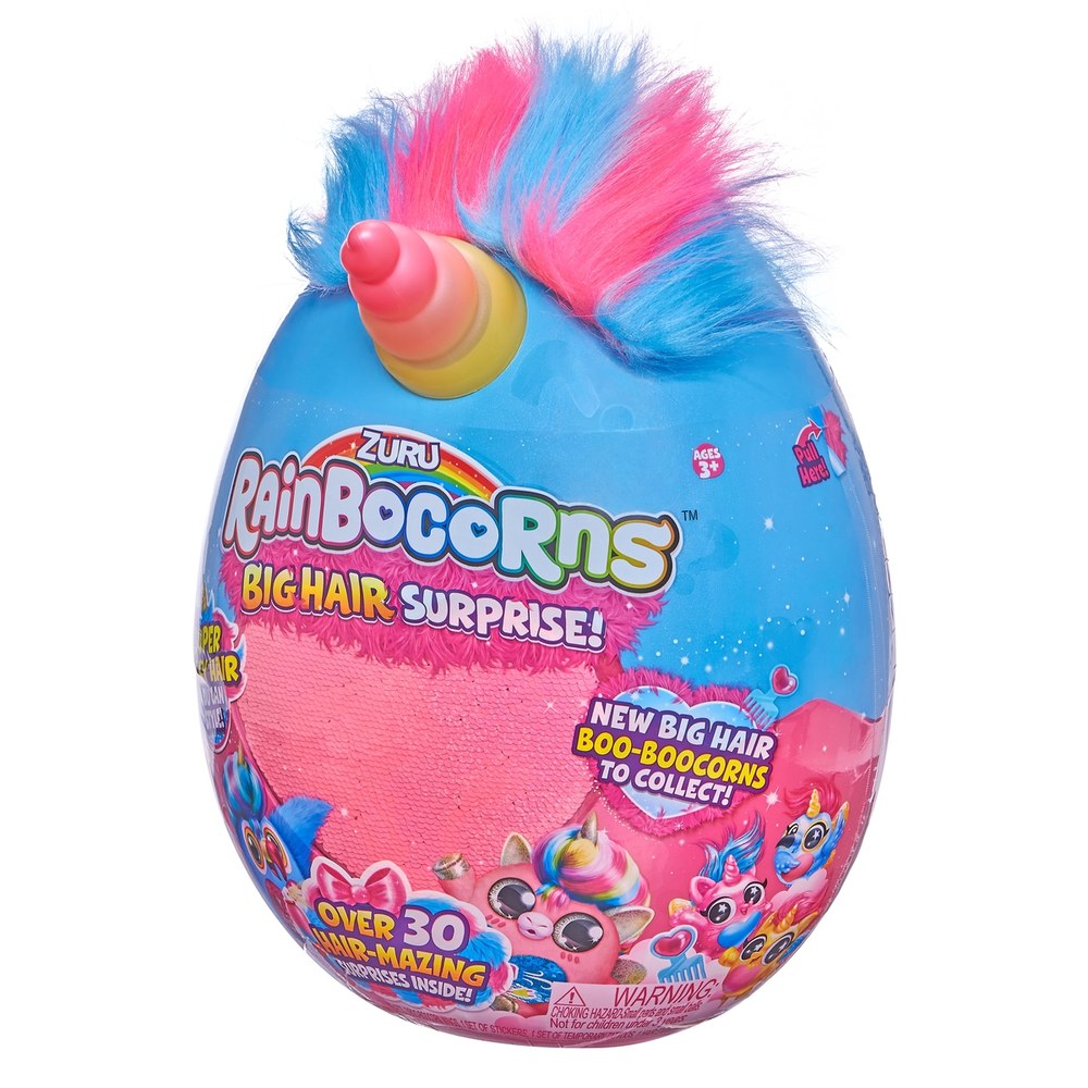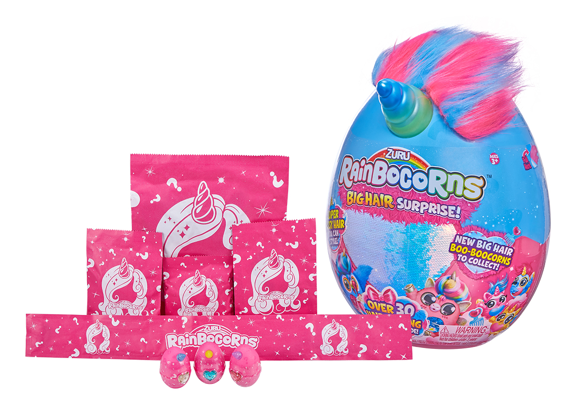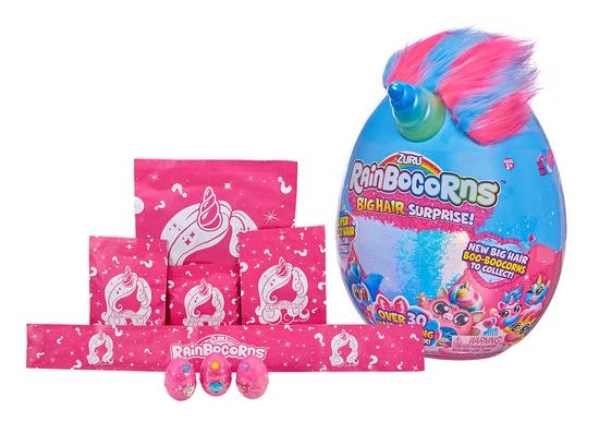 Obsah balení: velké dvoubarevné vejce, velký plyšák Rainbocorn, velká spona do vlasů, flitrová spona ve tvaru srdce, čelenka, mašle do vlasů, přívěsek, sada korálků, gumička, hřebínek se zrcátkem, 3 boo-boocorni, 3 vajíčka pro boo-boocorny, 3 prstýnky, 3 sponky do vlasů, 3 ozdoby ve tvaru srdce, 3 boo-boocorní křídla, aršík s dočasným tetováním, aršík se samolepkami, vlasový příčesek a sběratelský průvodce.
