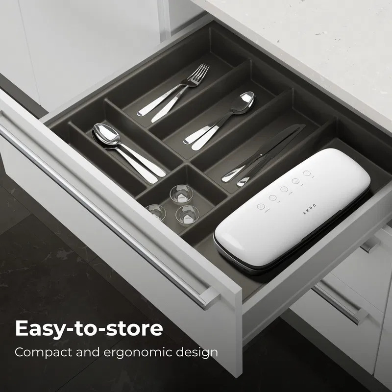 Vakuovačka AENO o délce 38 cm a tloušťce necelých 6 cm nezabírá mnoho místa a vejde se na každou polici.