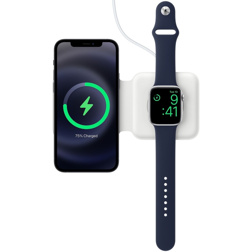 Dvojitá nabíječka pro Apple zařízení a kompatibilní zařízení s certifikací Qi má skladná konstrukci pro pohodlný převoz. MagSafe je nový ekosystém doplňků, které se snadno přicvaknou a podporují rychlejší bezdrátové nabíjení.