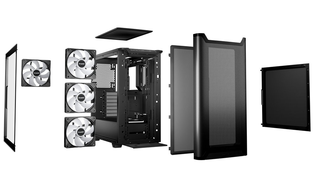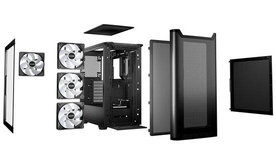Skříň s průhlednou bočnicí a ARGB LED osvětlením nabízí dvě 3,5" pozice pro pevné disky a pět 2,5" pozic pro SSD disky. Na horním panelu naleznete dva porty USB 3.0, jeden port USB-C a dále také konektor pro sluchátka a konektor pro mikrofon. Skříň je osazena třemi ventilátory Pure Wings 3 o velikosti 140 mm. Důmyslné řešení umožňuje pohodlné umístění až 360 mm dlouhého výměníku vodního chlazení na přední straně. Ve skříni je dostatek prostoru pro chladič CPU do výšky až 190 mm a grafickou kartu o délce až 369 mm. Skříň je dodávána bez zdroje. Potěší také přítomnost odnímatelných prachových filtrů.