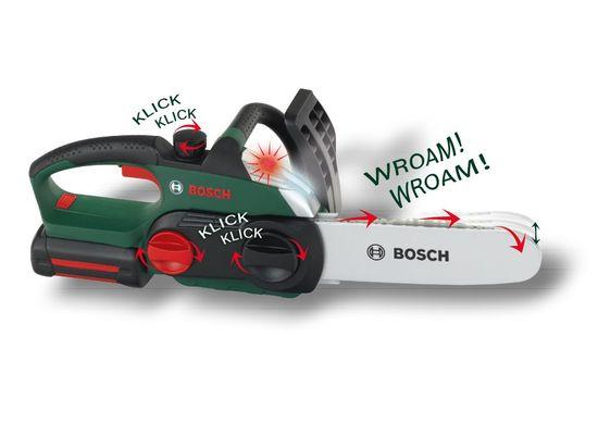 Dětská motorová pila v licenci značky Bosch, pro malé pomocníky na zahradě. Motorová pila vydává zvuky jako opravdová, Má pohyblivý řetěz, svítí, vydává zvuky u otáčení s uzávěry a různými kolečky. Produkt je na baterie 3xR6 (nejsou součástí balení). Baleno v krabici s výřezem. Doporučený věk 3+