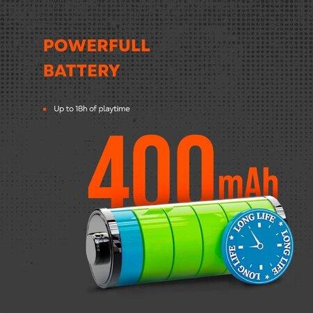 Baterie s kapacitou 400 mAh poskytuje úctyhodných 18 hodin přehrávání a plně se nabije za pouhé 2-3 hodiny prostřednictvím USB-C.