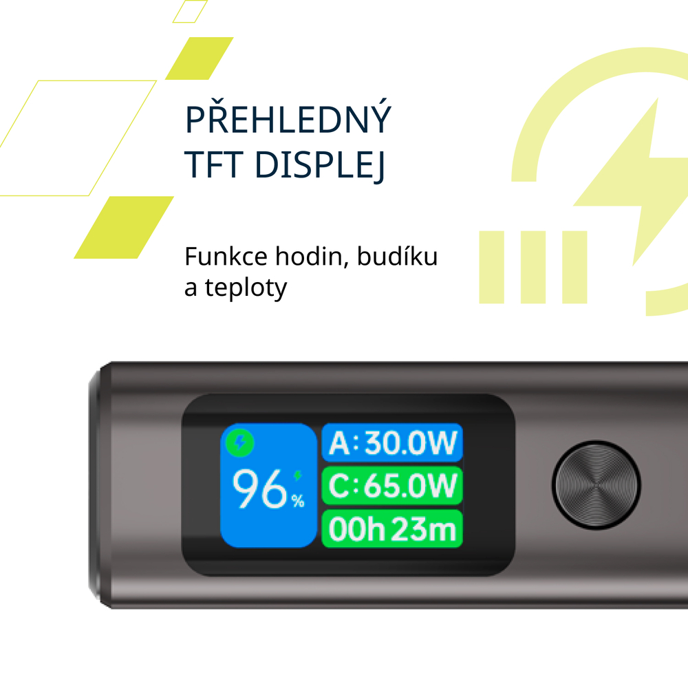 Inteligentní digitální TFT displej umožňuje snadno sledovat zbývající energii powerbanky, úroveň výstupu a stav nabíjení.