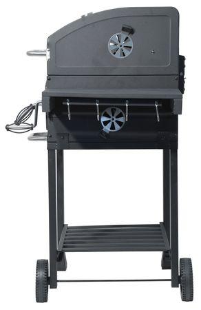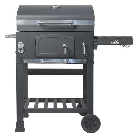 Konstrukce z oceli je opatřena hrubou černou barvou. Madla a ovládací kovové prvky, mají dostatečné rozměry pro pohodlný úchop a zajišťují precizní ovládání. Oboustranná regulace ventilace perfektně lícuje s konstrukcí. Další předností je rošt na uhlí s nastavitelnou výškou 9-21 cm od grilovacího prostoru, pomocí kličky na přední straně. Dvířka na čelní straně grilu usnadňují doplňování uhlí.