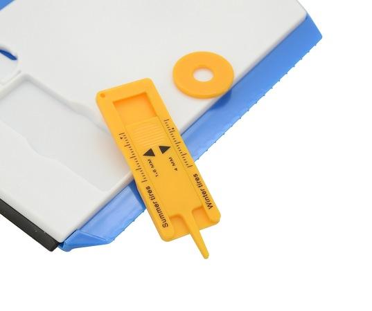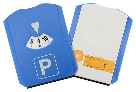 Tři hrany parkovacích hodin jsou provedeny jako břity škrabky, kterou lze použít na sníh, led a stranu s gumovým břitem i na vodu.