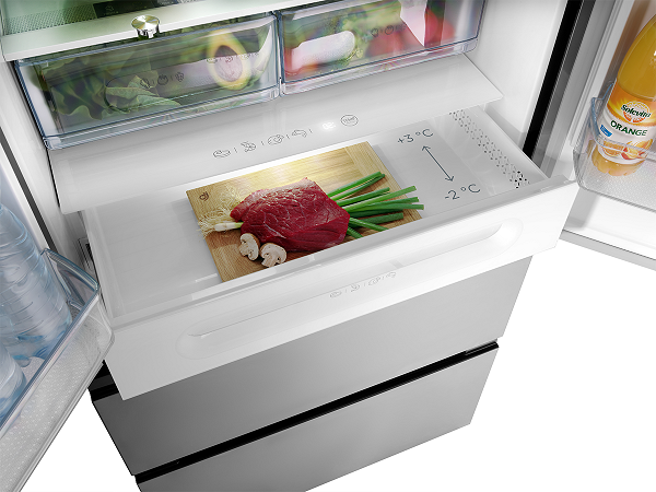 Ve spodní části chladničky se nachází velká, plně výsuvná variabilní zóna s možností nastavení teploty od -2°C do +3°C. Lze ji využít jako chladničku, nulovou zónu nebo soft mrazák. Díky vlastnímu zdroji světla máte vždy dokonalý přehled.