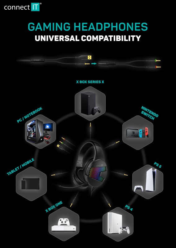 CONNECT IT DOODLE RGB herní sluchátka s mikrofonem, 2xJack+USB, ČERNÁ
