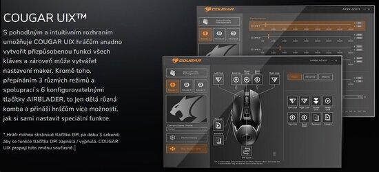 Myš AIRBLADER byla zrozena pro dokonalý zážitek z obratného ovládání. Podle pravidla forma následuje funkci jsme se snažili spojit minimální plochu, které se při používání myši dotýkáme, a pak ji proměnit ve fascinujícím způsobem nový vzhled. Přináší nejen extrémní lehkost, ale také zachovává brilantní pocit z používání. Mezitím je oboustranný a kompaktní design vhodnější pro drápovité styly úchopu. Pro ty, kteří mají rádi lehké myši, přináší AIRBLADER plynulé ovládání s vysokou přesností a zcela nový design, který ještě nikdo neviděl.