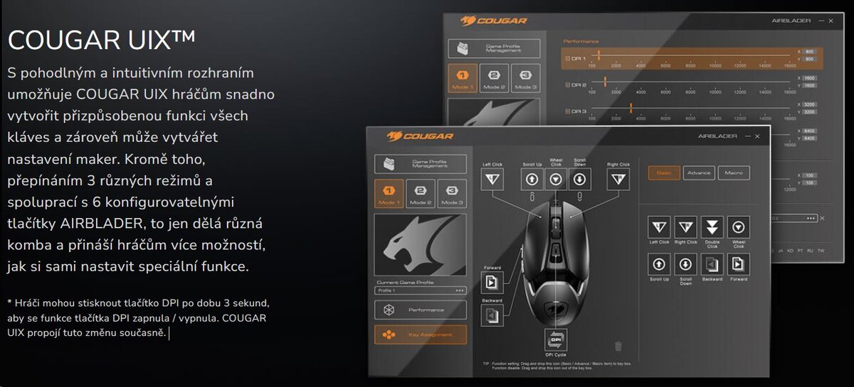 Lehká herní myš AIRBLADER je vybavena exkluzivním napínacím systémem COUGAR BOUNCE-ON, který využívá kovovou pružinu k eliminaci náhodného odskoku mezi tlačítkem a spínačem. Tímto způsobem by mohl být zachován stabilní, konzistentní pocit kliknutí pro lepší výkon při intenzivním hraní her. Proto bude lehká herní myš AIRBLADER bezpochyby nejlepším partnerem hráčů.