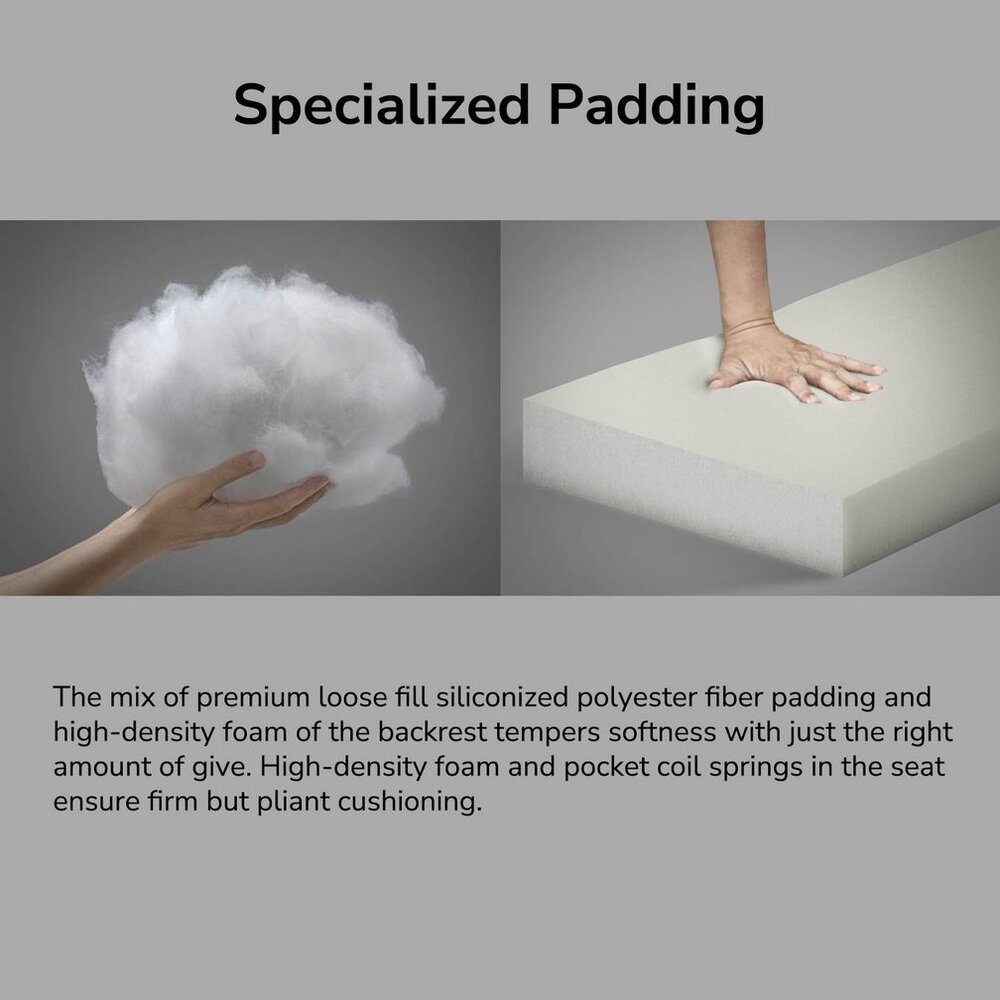 Kombinace prvotřídní výplně ze silikonových polyesterových vláken a pěny s vysokou hustotou opěradla zmírňuje měkkost se správnou mírou poddajnosti.