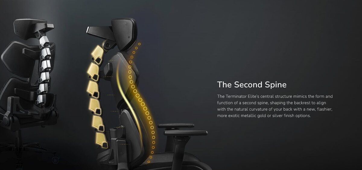 Centrální konstrukce Terminator Elite napodobuje tvar a funkci druhé páteře: kloub tvaruje opěradlo v souladu s přirozeným zakřivením vašich zad a pomáhá vám tak udržovat dokonalé držení těla.