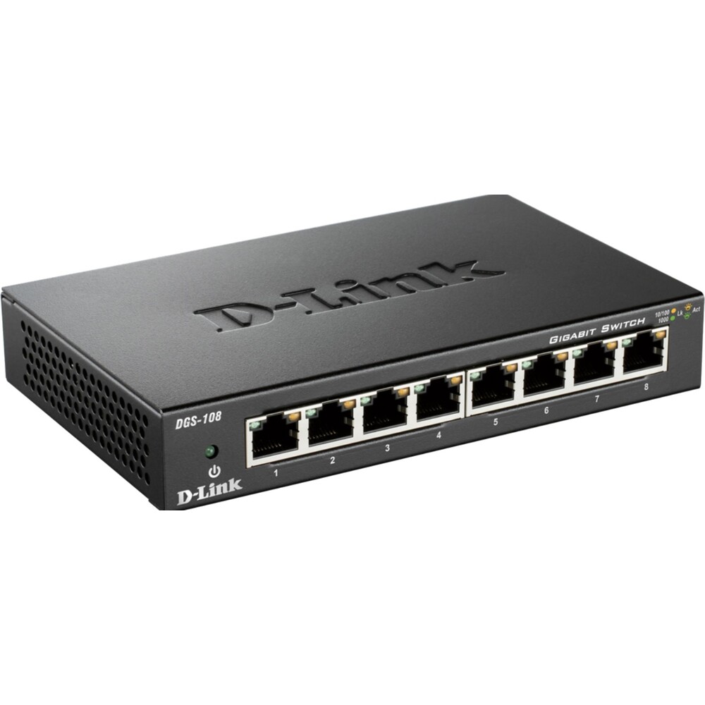 8-portový gigabitový neřízený stolní přepínač DGS-108. Nabízí ekonomický způsob pro malé a střední podniky, jak těžit ze zvýšené šířky pásma gigabitového Ethernetu. Poskytuje osm gigabitových portů pro snadné rozšíření vaší sítě a rychlý způsob upgradu sí
