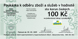 Dárková poukázka k nákupu v obchodním řetězci Albert (supermarket a hypermarket) Můžete ji využít i na tankování u čerpacích stanic, které jsou součástí Hypermarketů, včetně sortimentu čerpacích stanic (např. dálniční známka) Seznam čerpacích stanic: Brno-Modřice, Česká Lípa,Děčín,Frýdek-Místek,Havlíčkův Brod, Hodonín, Hradec Králové, Karviná, Klatovy, Králův Dvůr – Beroun, Kunovice – Uh.Hradiště, Mladá Boleslav, Nymburk, Olomouc, Opava, Orlová – Karviná, Pardubice, Plzeň - Černice Průhonice, Přerov, Příbram, Svitavy, Teplice Veškeré dárkové poukázky budou poslány přepravní službou PPL z důvodu pojištění.