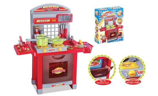 Kuchyňka má troubu, dvě plotýnky na vaření, dřez, odkládací plochu, věšák na kuchyňské náčiní a mnoho dalšího příslušenství. V balení najdete například hrnce, talíře, hrnečky, příbory, ovoce, zeleninu a kořenky.