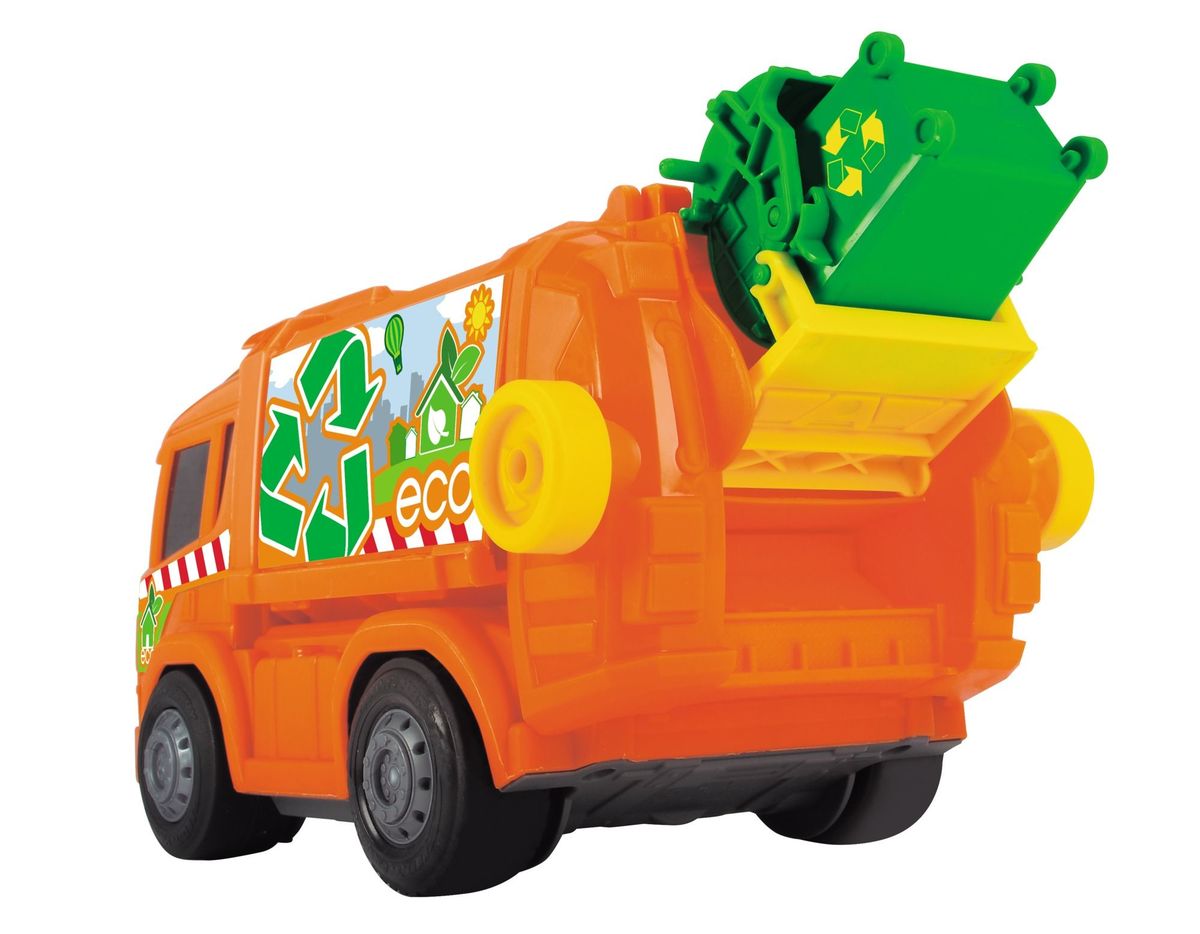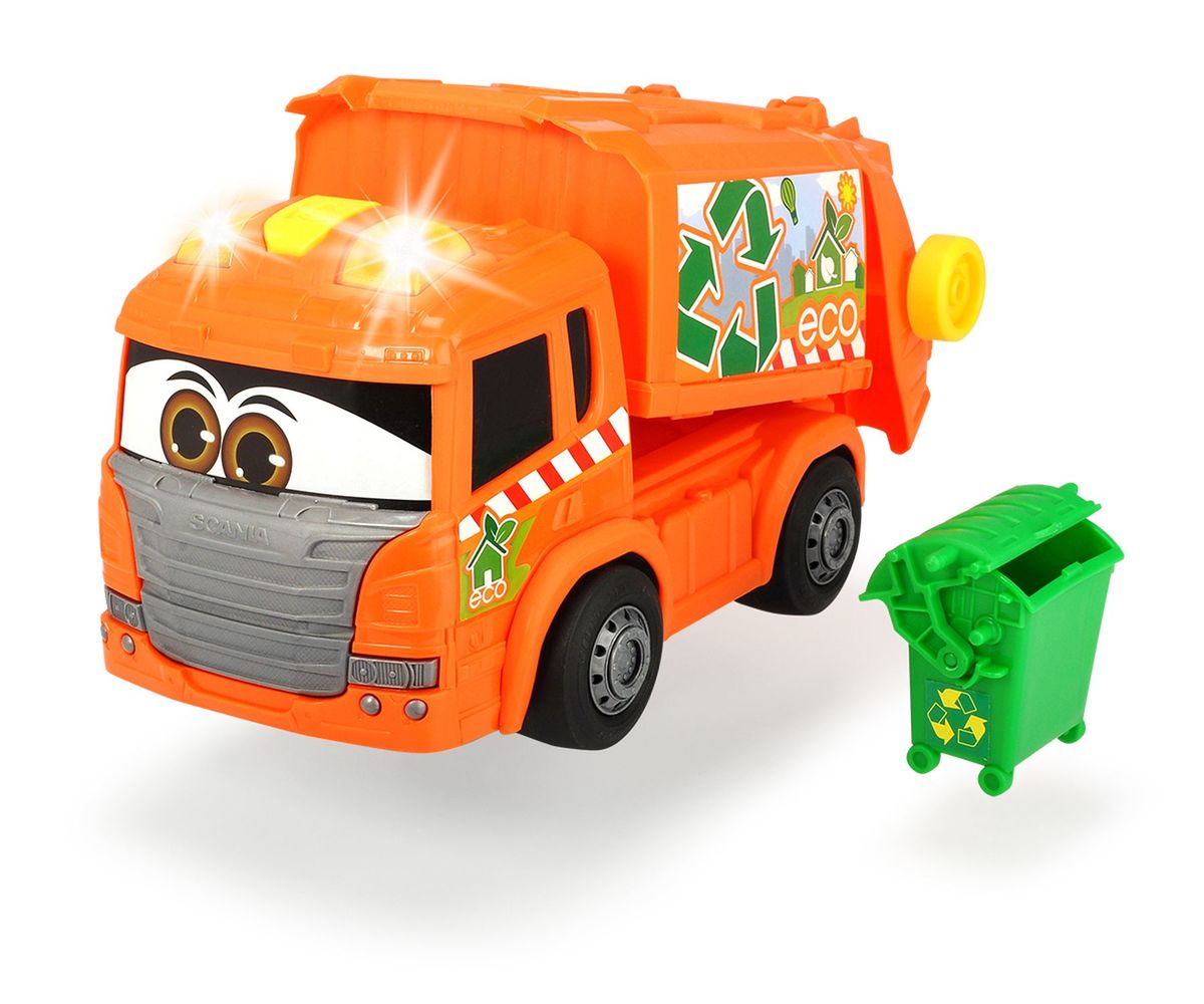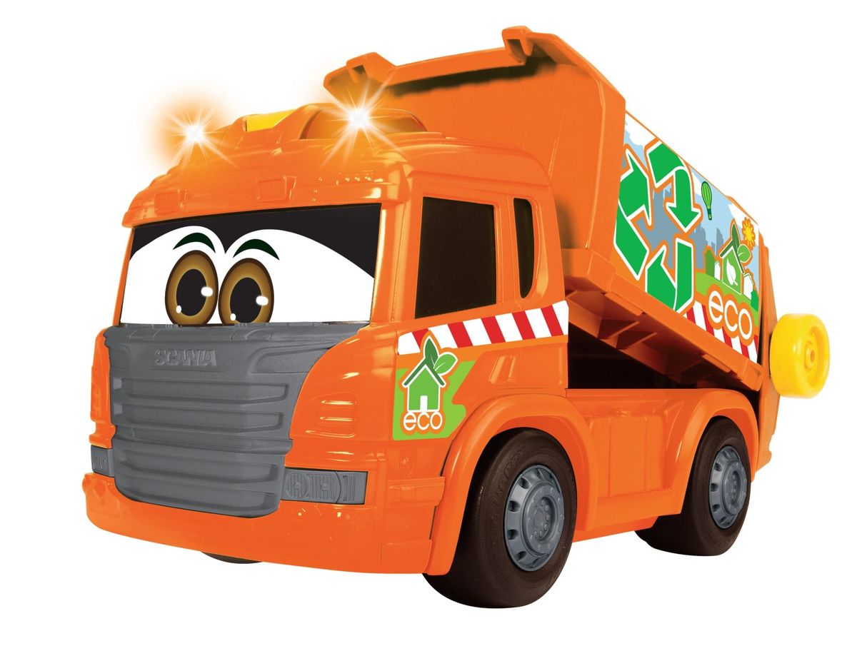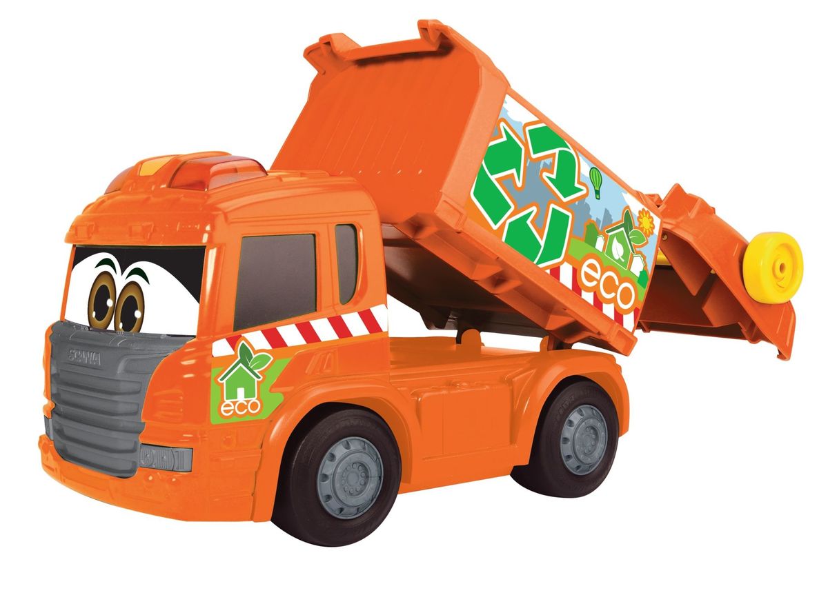 Oranžové popelářské auto z řady Happy s motorizovanou jízdou vpřed a vzad, možnost i volného pohybu. Zmenšená verze skutečného nákladního automobilu Scania. Světelný a zvukový efekt. Manuálně ovládaná korba (otevírání a náklon). Nakládací plošina se zvedá mechanicky, stejně jako zelený kontejner, který je součástí soupravy. Délka 25 cm.