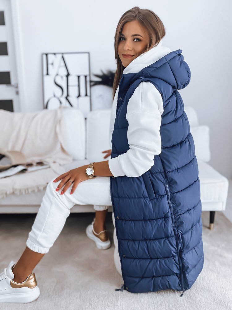 Prošívaná vesta ALENA: Prošívaná dlouhá vesta je perfektním řešením pro chladné dny. Model ALENA má po stranách zipy a vpředu dvě prostorné kapsy. Kapuce je odepínatelná. Vesta se zapíná na zip a druky, díky čemuž chrání před chladem. Modrá barva.; Složení: 100% polyester.; Rozměry modelu:: Boky: 85 ...