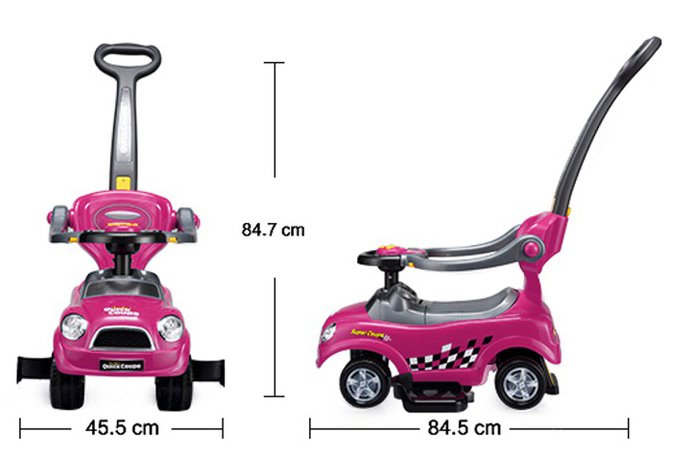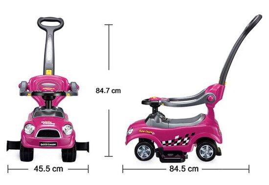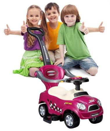 Růžové autíčko s vodící tyčí pro děti, které již samostatně sedí.