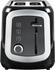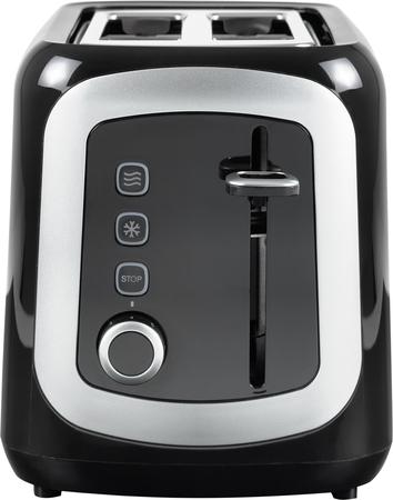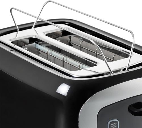 příkon 870 W, dva otvory, integrovaný ohřívač housek, funkce rozmrazování, elektronická regulace (7 stupňů), kontrolka zapnutí, kontrolka ohřevu, automatické vycentrování chleba, vyjímatelná miska na drobky, barva černá