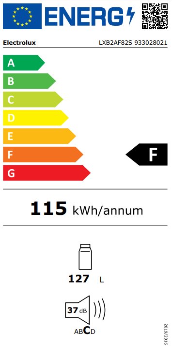 Technické specifikaceVlastnostiPerformanceHrubý objem chladničky (l)130Zavěšení dvířekVpravo, zaměnitelné dolevaIndikace vysoké teplotyNeníZmrazovací kapacita (kg/24h)0BarvaBíláEnergieEnergy supplyZnačkaElectroluxModelLXB2AF82SKategorie výrobkuChladničkaInstalaceVestavěný spotřebičPříkon (W)80Spotřeba el.energie (W/h)0.332Čistá kapacita chladícího prostoru (l)127Oddíl označen hvězdičkami-Čistá kapacita chladnější zóny (l)0Rozměry a instalaceRozměryVýška (mm)819Šířka (mm)560Hloubka (mm)547Vestavná výška (mm)820Šířka otvoru pro vestavbu (mm)600Hloubka otvoru pro vestavbu (mm)550Čistá hmotnost (kg)31.6Výška balení (mm)870Šířka balení (mm)600Hloubka balení (mm)620OstatníOther technical dataEAN kód produktu7332543761944Kód produktu (PNC)933 028 021Emisní třída hluku šířeného vzduchemCÚroveň emisí hluku šířeného vzduchem v dB(A) re 1pW37Roční spotřeba energie (kWh/rok)115Třída energetické účinnostiFKlimatická třídaSN-N-ST-T