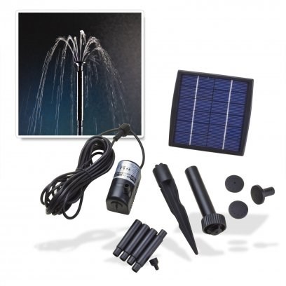 - Ponorné čerpadlo se středně jemným filtrem (určeno pouze na čistou vodu) a 4 sacími miskami, plynule nastavitelné dodávané množství, monokrystalický solární panel, zemní hrot se zástrčkovou spojkou, 4 různé trysky, 4 trubkové segmenty se zástrčkovou spojkou.