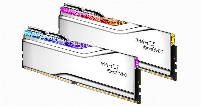 Trident Z5 Royal Neo je luxusní třída pamětí DDR5 s extrémním přetaktovacím výkonem určená pro platformy AMD AM5, která se vyznačuje designem korunního klenotu s krystalickou světelnou lištou pro velkolepé zobrazení přizpůsobitelného osvětlení RGB a galvanicky pokovenými hliníkovými heatspreadery se zrcadlovou povrchovou úpravou ve zlaté nebo stříbrné barvě.