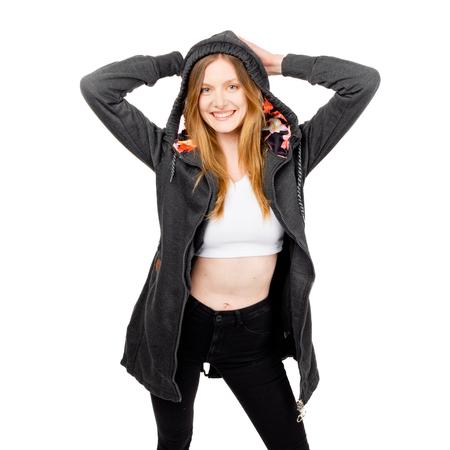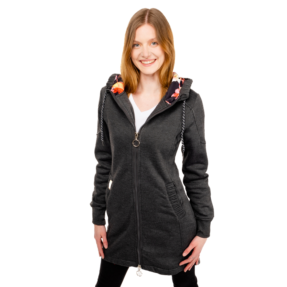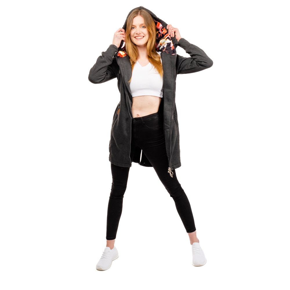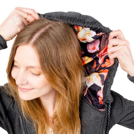 - prodloužená vypasovaná mikina s řasenou kapucí s květinovým vzorem