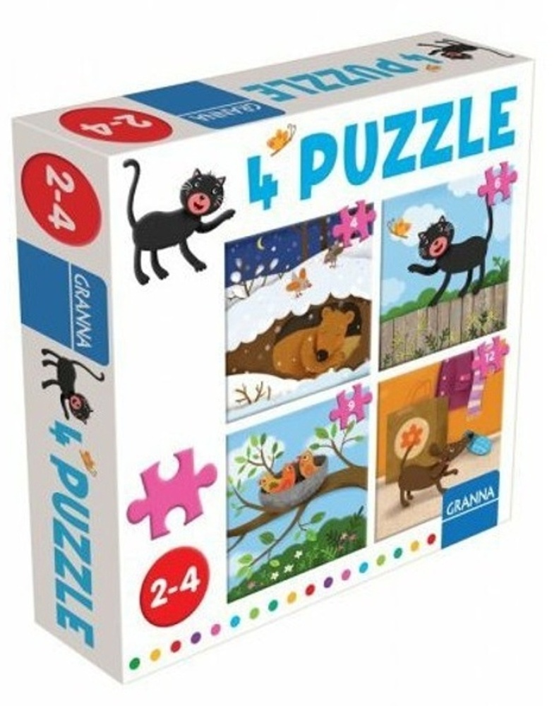 Pes, kočka, ptáčata, medvídek ve spánku, poskládej obrázek, nauč se říkanku. Skládačka pro děti ve věku 2 – 4 roky sestává ze 4 puzzle s obrázky zvířátek v různých obtížnostech. Medvídek – 4 dílky puzzle. Kočka – 6 dílků puzzle. Ptáčkové – 9 dílků puzzle. Pejsek – 12 dílků puzzle. Vyrobeno z ...