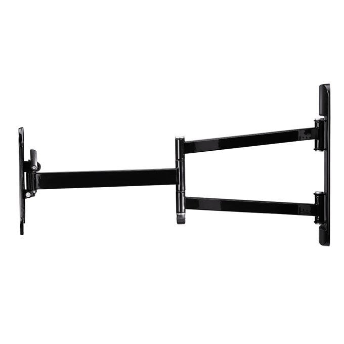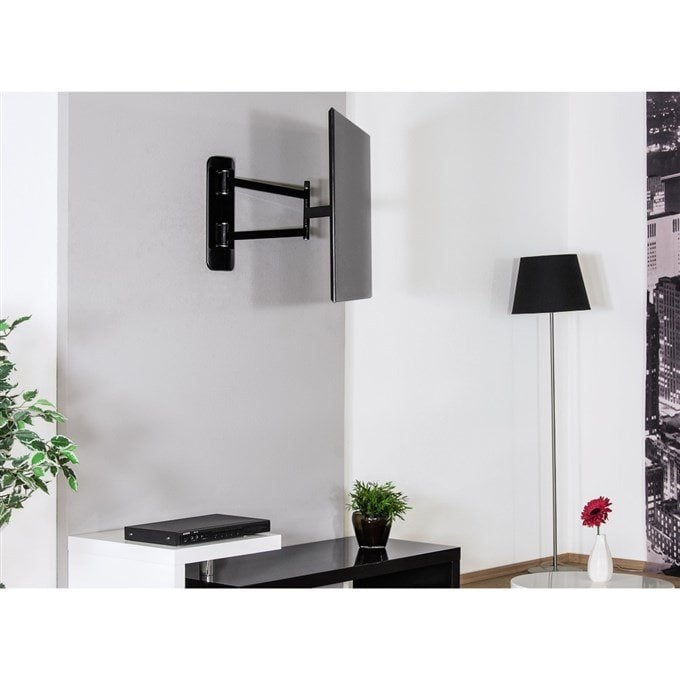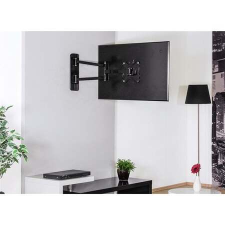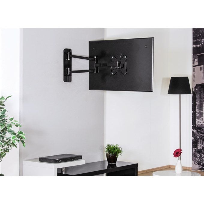 Pohyblivý nástěnný držák pro ploché obrazovky s úhlopříčkou 10" až 46" a pro standard VESA 75 x 75 až 200 x 200. Maximální nosnost držáku činí 25 kg. Díky 2 prodlouženým ramenům a 3 kloubům můžete držák natočit do stran o 180° a naklonit o 15°.