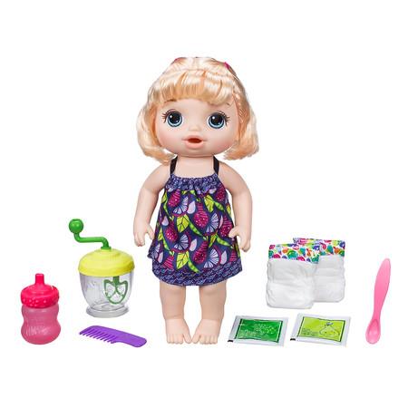 Blonďatá panenka s mixérem nabízí dětem nový zábavný způsob jak se starat o svou panenku. Panenka pije vodu a jí speciálně pro ni připravené jídlo. Stačí v mixéru (součástí balení) smíchat brokolicový nebo hruškový prášek s vodou a ihned je na světě skvělé jídlo pro vaši panenku. Stačí otáčet rukojetí a mixér vše spolehlivě promíchá. Pak stačí po lžičkách panenku nakrmit a pak jí dát napít z lahvičky. Když se panenka pokaká, je čas vyměnit plínku. V balení je panenka s odnímatelným oblečením, mixér, lžíce, lahvička, dva sáčky s jídlem, 2 plenky a hřebínek.