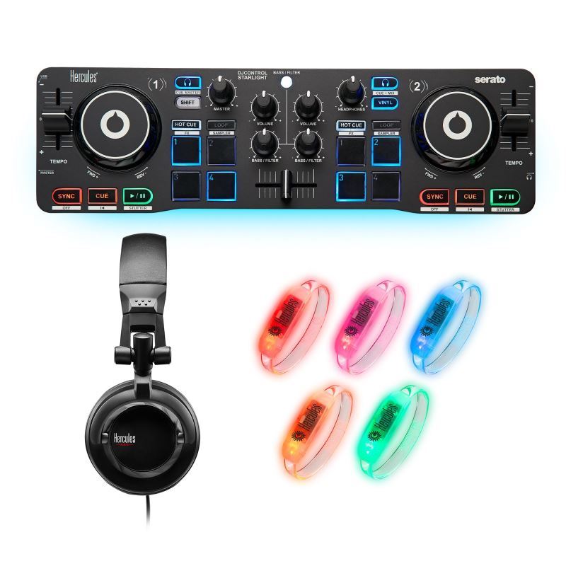 Zahrnuje mixážní pult  DJControl Starlight pro mixování a scratching hudby pomocí Serato DJ Lite, sluchátka HDP DJ45 a 5 světelných LED náramků, které se synchronně rozsvěcují do hudby. Tato přenosná sestava vám umožní okamžitě uspořádat večírek!