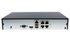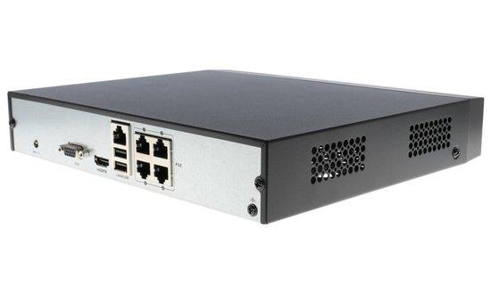 Záznamové zařízení pro 4 IP kamery s podporou PoE+ napájení (max. 36 W, IEEE 802.3af/at). Povoleny kombinace různých rozlišení do 6 Mpx a datový tok do 60 Mb/s. Podpora živého náhledu, ukládání a přehrávání připojené kamery. Zařízení podporuje také kamery třetích stran a dekódování H.265+, díky kterému můžete ušetřit až 70 % datového objemu. K dispozici je jedna pozice pro SATA pevný disk s kapacitou až 6 TB.