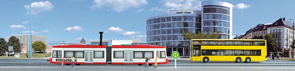 Kloubová tramvaj s designem mezinárodně zastoupeného výrobce Bombardier je realistický model v měřítku 1:87. Zadní část tramvaje je dokonce vybavena uzamykatelným barem. Spojovací systém umoňuje připojení dalších modelů. Vhodné pro děti od 3 let.