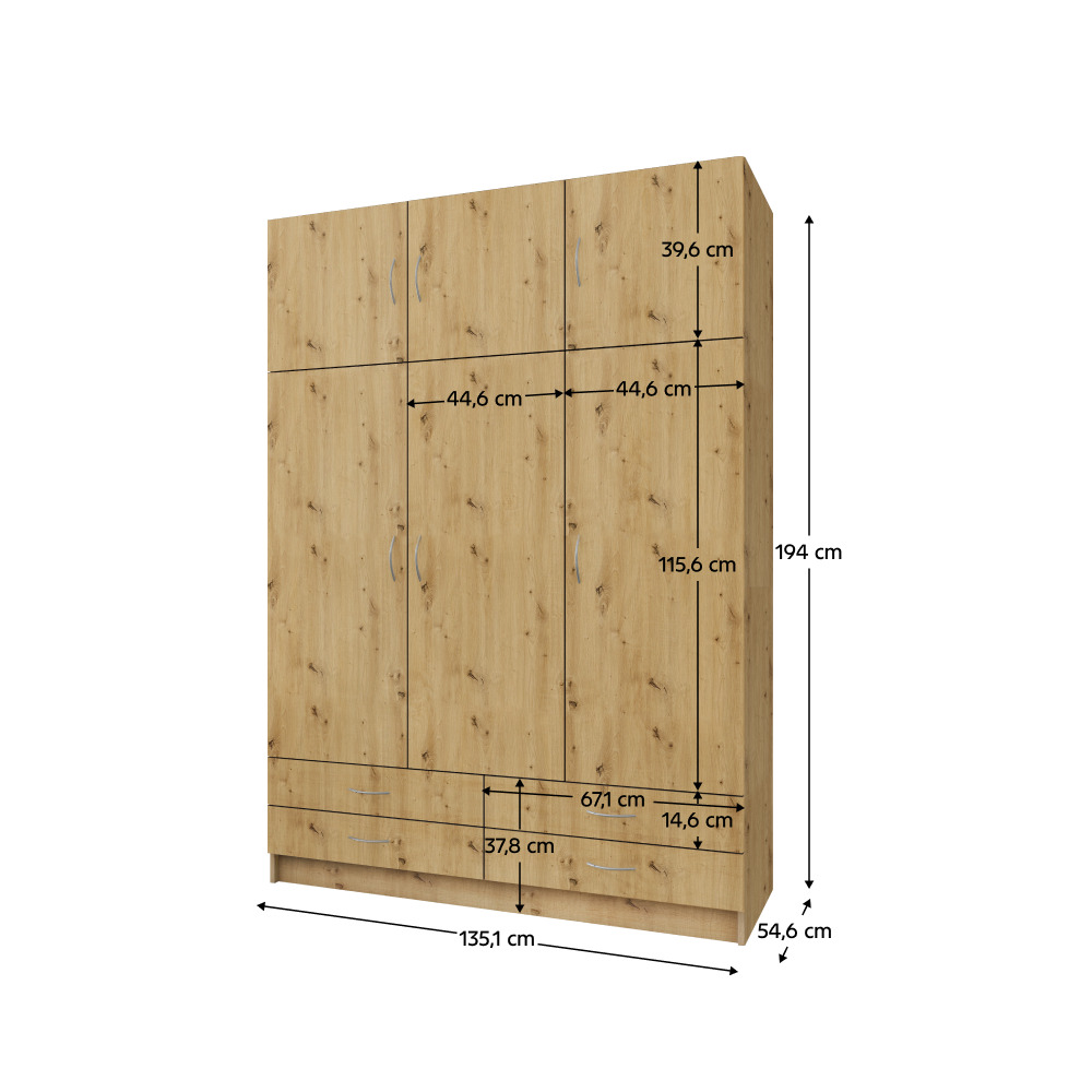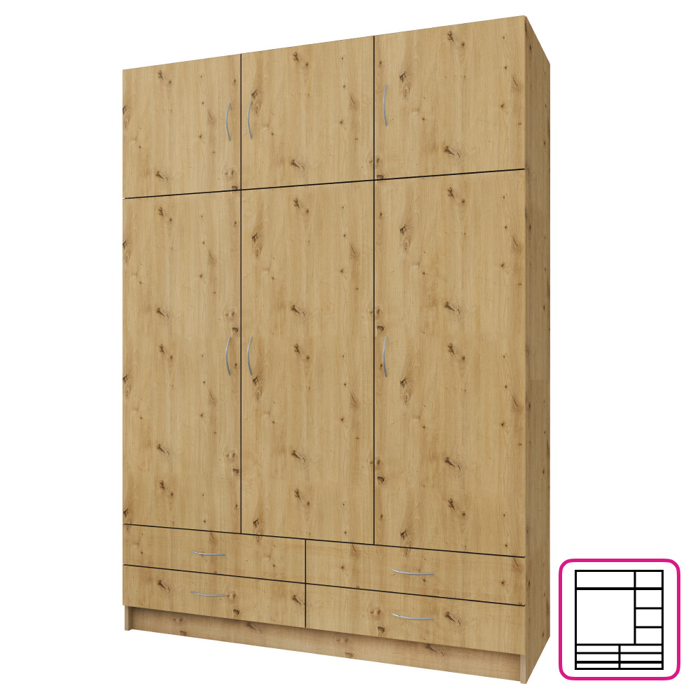 Šatní skříň Kondela GERI NEW je jednoduchá, moderní a vyznačuje se čistými liniemi. Nabízí spoustu praktického úložného prostoru a to v podobě polic a věšákové části, kde si můžete pohodlně zavěsit kabáty a šaty. Ve spodní části se nacházejí čtyři prostorné šuplíky, které poskytují další možnosti organizace. Vrchní část skříně doplňují praktické nástavce. Skříň je vyrobena z laminované DTD v barvě dub artisan. Pro snazší manipulaci s dvířky, je skříň obohacena o kovové úchytky. Šatní skříň GERI NEW dokonale zapadne do každého interiéru a zajistí přehledné uspořádání vašich věcí.