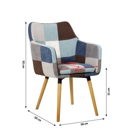 Designové křeslo Landor Materiál: dřevo / látka Oděruodolnost textilie podle testu Martindale: 60 000 oděrek Provedení: modrá / béžová vzor patchwork / buk Rozměry (ŠxHxV): 58x60x92 cm Výška sedu: 51 cm Hloubka sedu: 46 cm Šířka sedu: 42 cm Nosnost: 90 kg Dodávané v demontu.