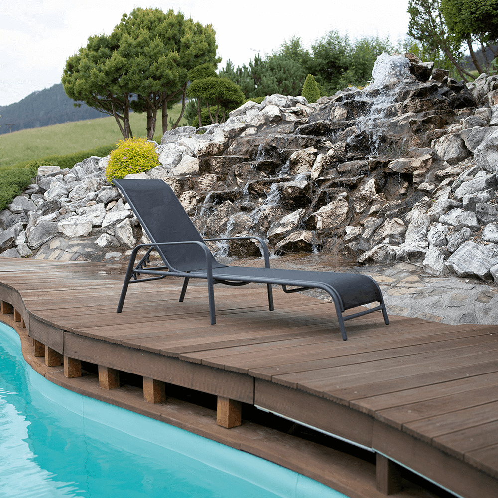 Materiál: látka / kov Provedení: černá / šedá Rozměry (ŠxHxV): 64x161x48 / 100 cm Výška sedu: 28 cm Hloubka sedu: 104 cm Celková hloubka po sklopení: 195 cm Nosnost: 90 kg polohovací S područkami Dodávané v demontu. Parametry produktu: kategorie Kondela; Zahrada > Zahradní nábytek > Zahradní ...