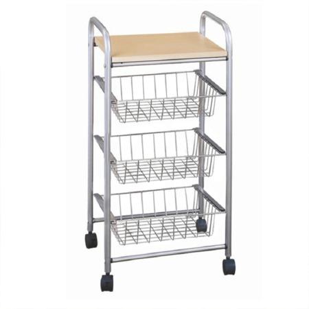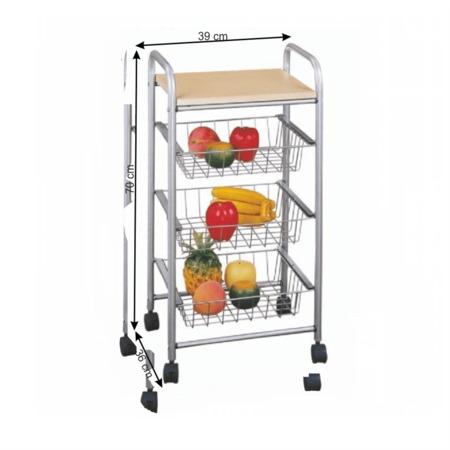 Rozměry (ŠxHxV): 39x36x70 cm Tloušťka materiálu: 15 mm Materiál: MDF buk/ kov Pojízdný regál 3 drátěné košíky Dřevěná polička 4 otočná kolečka Dodáváno v demontu Parametry produktu: kategorie Kondela; Kuchyně a jídelna > Servírovací stolky; váha; 4.50; barva; Šedá; hloubka; 36.0; výška; 70.0; šířka; ...