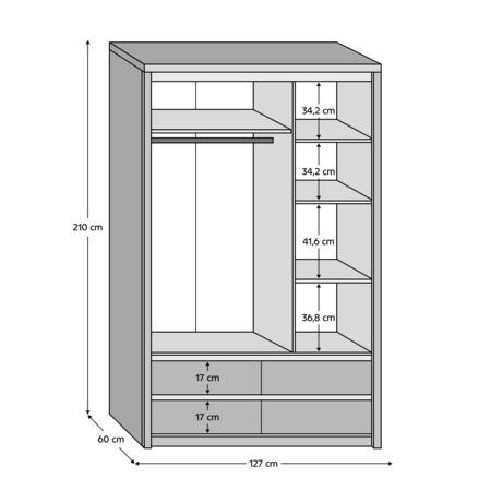 Skříň 3D4S NORTY Materiál: DTD laminovaná Provedení: dub sonoma Rozměry (ŠxHxV): 127x60x210 cm Tloušťka materiálu: 32 mm Tloušťka materiálu zbývající části: 16 mm Věšáková Policová Čtyři šuplíky Zrcadlo Dodávané v demontu Parametry produktu: kategorie Kondela; Ložnice > Skříně a úložné systémy; ...