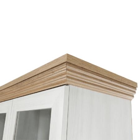 Vitrína W4D, čtyřdveřová z elegantního sektorového systému Royal v provensálském stylu. Vhodná na zařízení obývacích pokojů či ložnic. Materiál: korpus DTD laminovaná + ozdobné lišty, kovové úchytky Barevné provedení: sosna skandinávská v kombinaci s dubem divokým. Rozměry ŠxHxV: 87x39x187 cm Tloušťka materiálu korpus: 15 mm Tloušťka materiálu vrchní desky: 22 mm Dodávané v demontu.