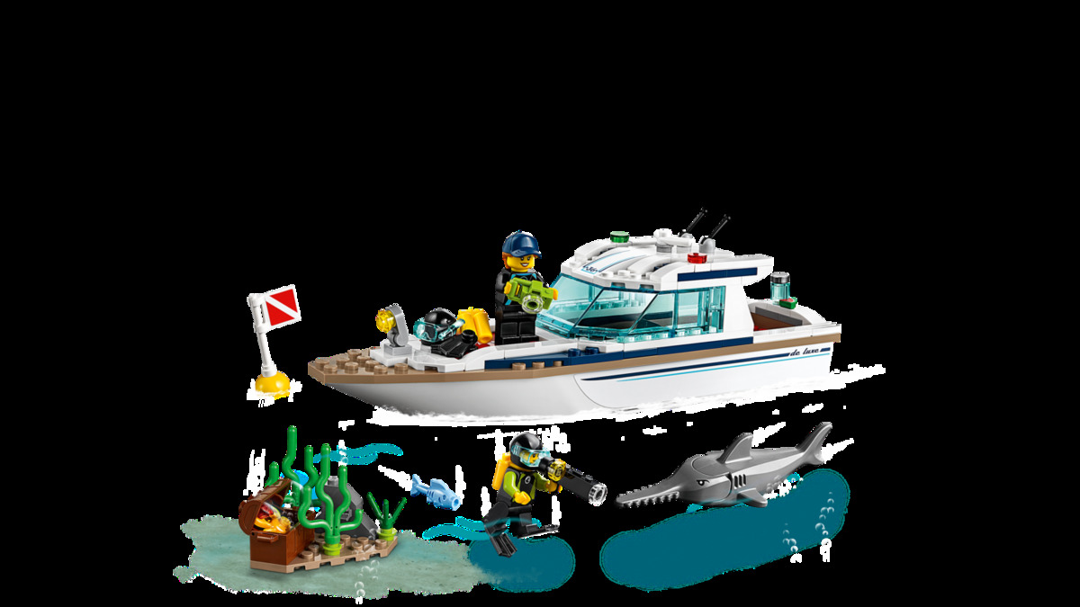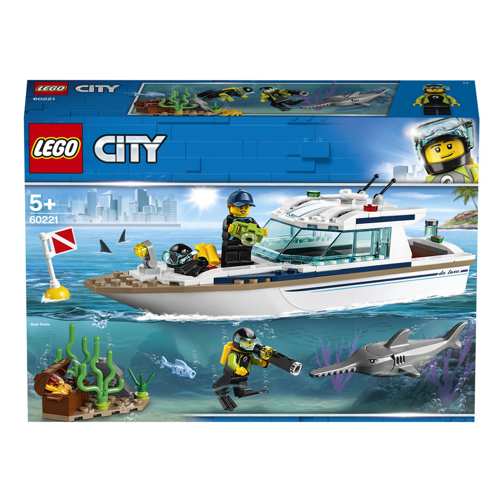 Vydej se na vzrušující dobrodružství na palubě potápěčské jachty! Prozkoumej podmořský svět se sadou LEGO® City 60221 Potápěčská jachta! Tato super luxusní potápěčská jachta nabízí sluneční terasu, odnímatelnou střechu, otočný světlomet a prostor uvnitř na spaní a skladování výbavy, a navíc stavebnice obsahuje mořské dno s řasami a otevírací truhlou s diamantem. Zábavná potápěčská sada rovněž zahrnuje bóji, 2 LEGO minifigurky potápěčů a figurky mečouna a kraba.