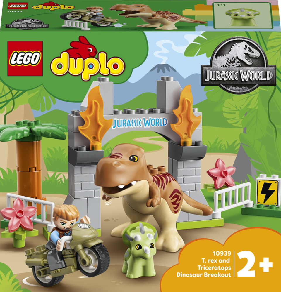 "Stavebnice T-rex a triceratops na útěku od LEGO® DUPLO® Jurský svět (10939) je plná zábavných doplňků a přenese vás do akčního světa filmového trháku Jurský svět – malí milovníci dinosaurů budou nadšením bez sebe.
