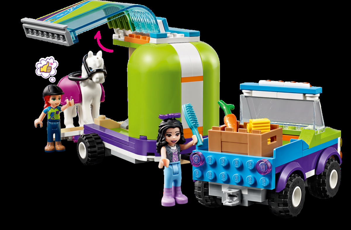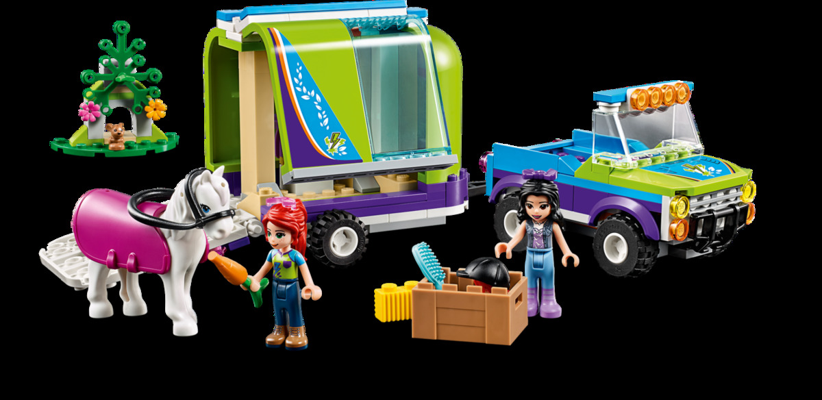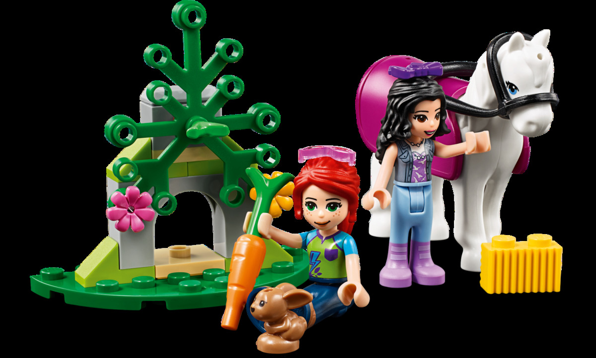 Dále v ní najdeš sestavitelnou buginu 4x4 a LEGO® Friends přívěs pro koně s odklápěcí boční stranou a zadními vrátky, sestavitelnou lesní krajinu pro králíka a krabici doplňků pro péči o koně.