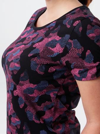 Dámské triko LOAP ABAJA s krátkým rukávem má klasický střih (Regular Fit) s kulatým výstřihem a rovným spodním okrajem. Je z bavlny a elastanu (5 %), proto je pružnější, přiléhavější a méně se mačká. Tričko je v základu černé, je však celé potištěné abstraktními růžovo-šedými tvary. Díky střední ...