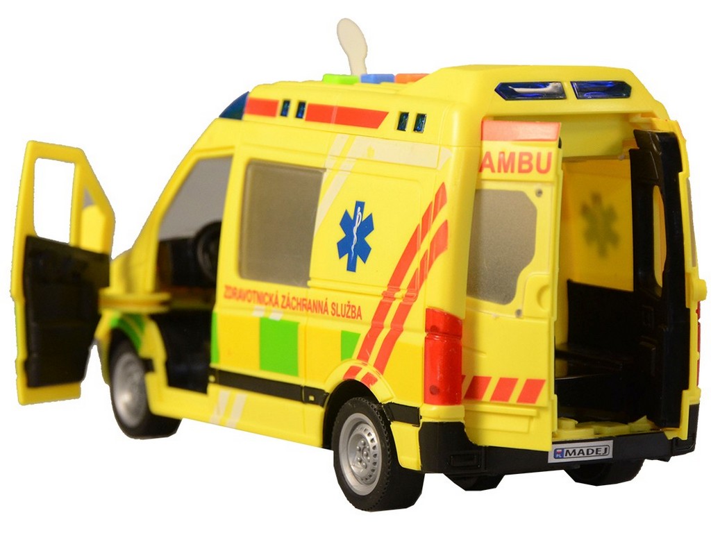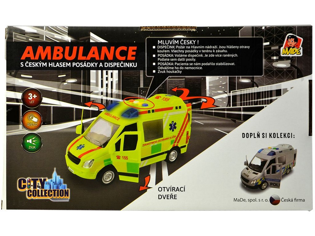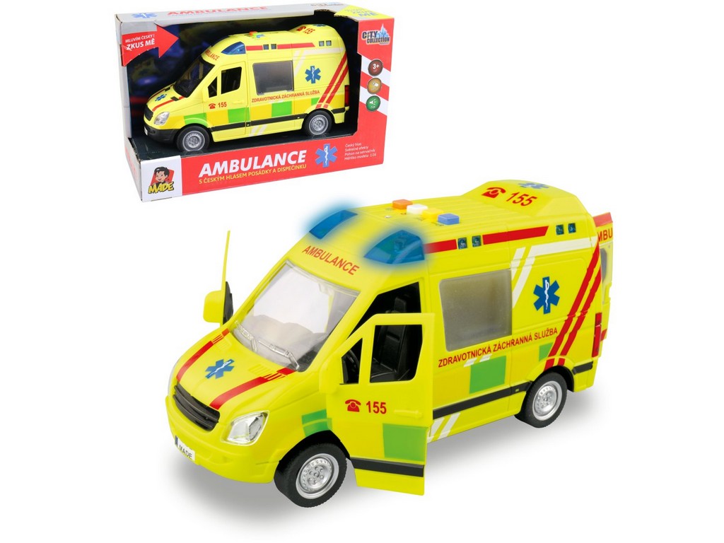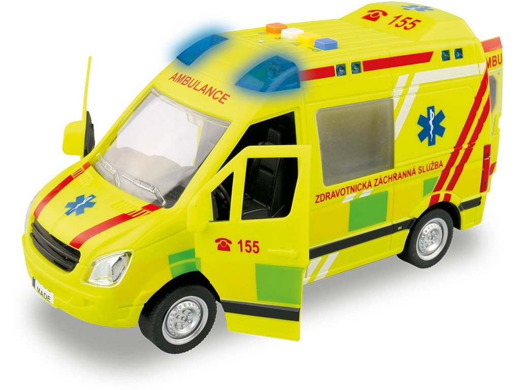 Vůz rychlé zdravotnické záchranné služby v reálném zbarvení a designu ambulance, známé z českých silnic. Ambulance jezdí na setrvačník a je vybavena funkčním majákem s modrými výstražnými světly a hlasem posádky vozu a dispečinku.Otevírací dveře. Měřítko modelu 1:16, délka auta 21 cm.DISPEČINK: "Požár na Hlavním nádraží. Jsou hlášeny otravy kouřem. Všechny posádky v terénu k zásahu".POSÁDKA: "Voláme dispečink. Je zde více raněných. Pošlete sem další posily". POSÁDKA: "Pacienta se nám podařilo stabilizovat. Odvážíme ho do nemocnice".Ambulance je na napájena třemi bateriemi AG13, které jsou součástí hračky. Doporučený věk 3+. Rozměry boxu 27 x 11 x 16 cm.