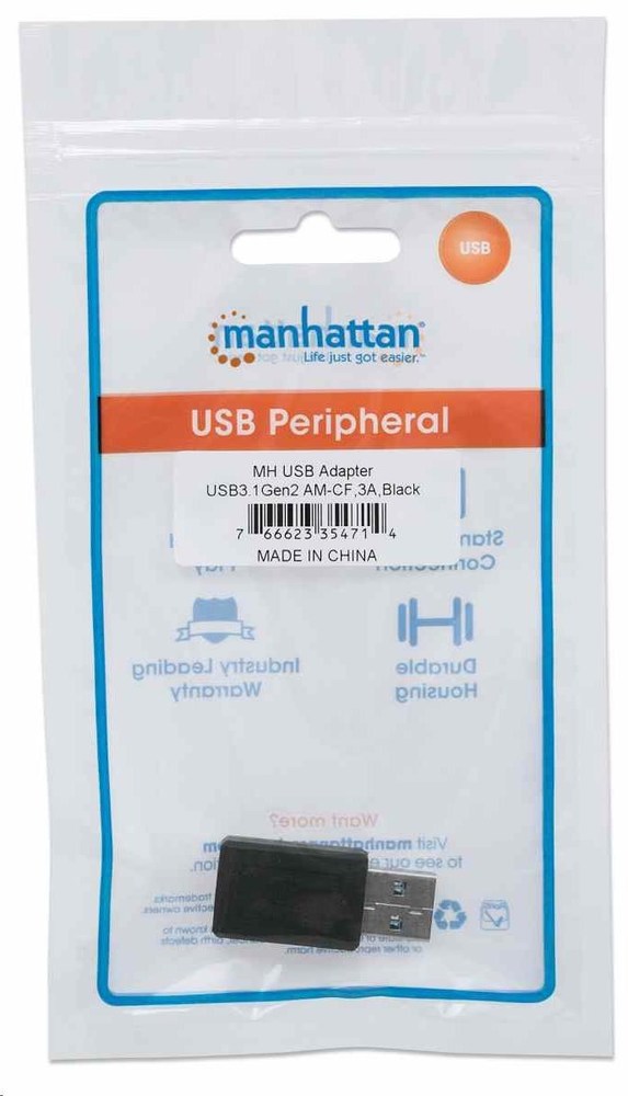 Manhattan USB 3.2 Gen 2 Type-C to Type-A Adapter je ultrakompaktný adaptér, ktorý umožňuje pripojenie kábla USB-C alebo zariadenia k portu USB Type-A. Meria len 27 milimetrov (1 palec).), adaptér je navrhnutý s ohľadom na prenosnosť a jednoduchosť. Vďaka možnostiam nabíjania a synchronizácie s rýchlosťou až 3 A, resp. 10 Gb/s budete mať svoje zariadenie rýchlo a jednoducho pripravené na čokoľvek, čo vás čaká.