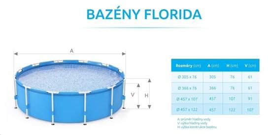 Bazén Marimex Florida 3,05 x 0,76 m 10340092 se řadí mezi velmi oblíbené nadzemní bazény v České republice. Koupání ve vlastním velkém bazénu si může dopřát opravdu každý. Předností bazénu Florida je výhodná cena, snadná údržba. stabilita konstrukce, široká hladina vody i snadné zprovoznění. Stačí jen připravit místo na bazén, rozvinout bazénovou podložku, bazén rozbalit, sestavit podpěrnou konstrukci, na kterou se navlékne bazénová folie. Od vybalení bazénu můžete do 30 minut napouštět vodu. Bazén je nutné po skončení bazénové sezony vyčistit, vypustit a uklidit na suché, nemrznoucí místo. Správnou údržbou prodloužíte životnost bazénu. Doporučujeme bazén po koupání zakrývat krycí plachtou.